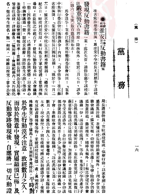 1929年11月12日,是孙中山生辰纪念日,学校放假。省立淮安中学利用假期在学校操场上举行了党童子军宣誓礼。在整理操场时,在操场晨操示范台下面,竟然发现多本共产党宣传书刊和一本共产党淮安中学支部的会议录,这被称为“淮安中学发现反动书籍案”。
