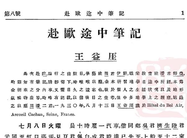 1930年4月,王钟麒计划赴欧洲留学。7月8日,他在上海虹口码头登上了“照国丸”号游轮,前来送别的有他在省八中(扬州中学)、淮安中学的同事和常熟同乡友人,如省立五师(扬州)校长任孟闲,省六中(镇江中学)校长薛良叔,省四中(太仓中学)校长顾仲超,八中及淮中同事夏佩白、周伊耕、华汝成、朱慰真等。游轮先后经过香港、新加坡,过马六甲海峡,经苏门答腊、科隆坡、阿拉伯海、红海、苏伊士运河,进地中海,8月7日到达法国马赛。9日,抵达巴黎。整个行程为一个月,作为地理学家的王钟麒将一路所见所闻以日记形式记录在《赴欧途中笔记》长文中,既有地理上的介绍,也有对当时国际国内时事的关注。