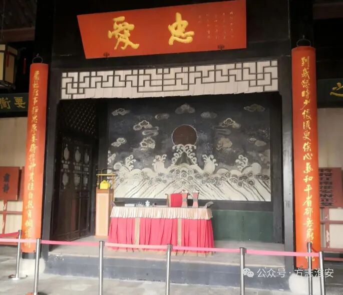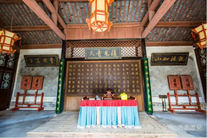 沿着院内青石铺就的百米长甬道前行,便来到了知府处理公务的淮安府衙前。府衙大堂东西长26米,南北宽五间,深长18.5米,脊高10米,面积约500平方米,颇为壮观。大堂上方悬挂着一块红底金字“忠爱”匾额,这是由皇帝钦赐的,要求官员要忠于皇帝,爱护子民。大堂前黑漆抱柱金联格外引人注目,上联是“吃百姓之饭,穿百姓之衣,莫道百姓可欺,自己也是百姓”,下联是“得一官不荣,失一官不辱,勿说一官无用,地方全靠一官”。此联以平实的语言,点出了为官之重,教育官员莫高高在上,别忘了百姓身份,极富民本意识。
