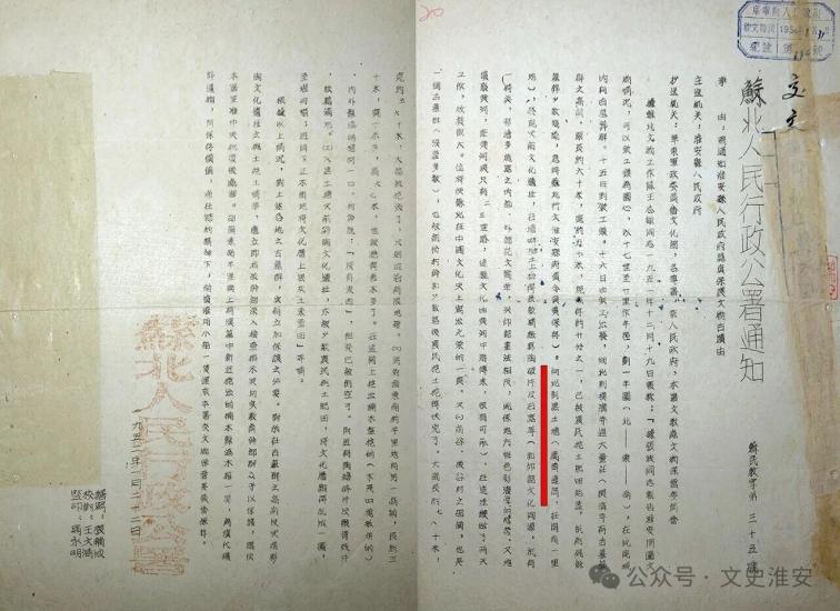 1952年扬州苏北人民行政公署下达的保护文物通知