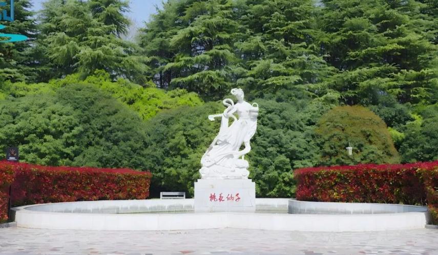 桃仙广场上的桃花仙子雕塑是整个公园景区的标志性建筑,3.5米高的雕塑全身用汉白玉制成,洁白无瑕,飘逸灵动,雕刻者是一位参与过毛主席纪念堂建造的雕刻大师。“桃花坞里桃花庵,桃花庵里桃花仙;桃花仙人种桃树,又摘桃花卖酒钱。”不同于明代唐伯虎《桃花庵歌》里描绘的那位安贫乐道、逍遥洒脱的桃花仙人,这里的桃花仙子是一位美丽善良、含情脉脉的仙女形象。传说她原本是王母娘娘蟠桃园的仙子,因偷偷下凡帮助此地的青年培育出硕大的果桃而被抓回天庭受罚。青年苦等仙子不归,竟变成了一株朴树。后仙子重降人间,也变成一株朴树,与青年紧紧依偎在一起。今桃仙广场的东北角有一株连体的朴树,据说就是桃花仙子和青年呢。