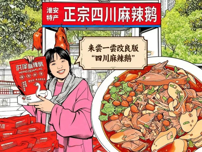 四川的辣与淮安的鹅,造就了独特的淮安风味。1990年,四川泸州的潘国富兄弟来到洪泽三河油田工作,因不习惯当地饮食,便尝试复刻家乡的麻辣鸡,将本地老鹅与四川花椒、麻椒等调料结合,意外成就了淮安特产“四川麻辣鹅”。这道菜最初在三河油田附近流行,后逐渐风靡洪泽乃至整个淮安,从街头小摊发展成“国民卤味”。“洪泽湖渔姑娘”将四川的辣与洪泽的鹅巧妙结合,逐步改良,造就了川渝麻辣和淮扬风味的完美融合,给广大食客带来了更多更丰富的舌尖享受。