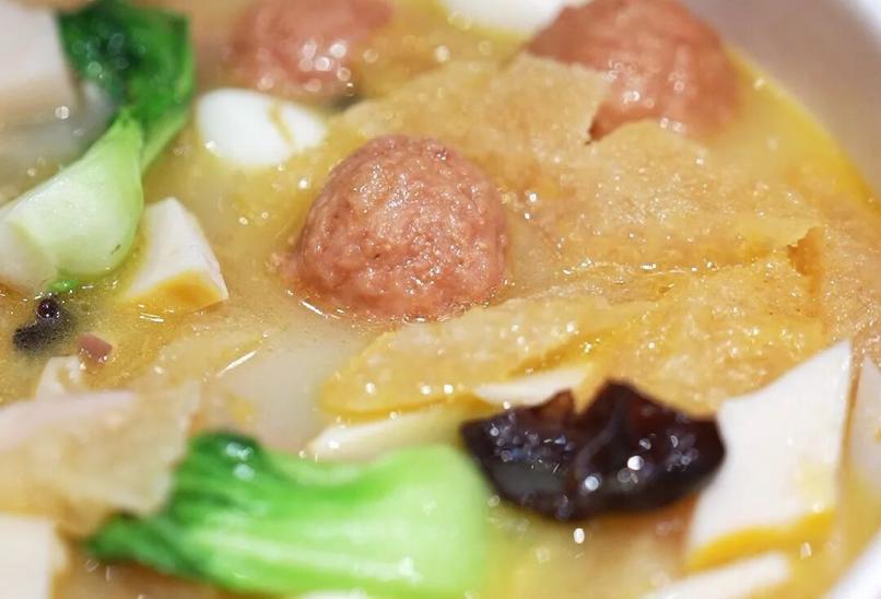 嫩滑的皮肚在下锅前,还少不了最后的工序,需刀刃斜切成菱形,迅速焯水去油,减少肉皮的油腻,让其最大程度地吸饱浓汤。万事俱备,属于它们的团圆时刻终于到来了!皮肚最先倒入高汤,在火候的加持下,片片皮肚颤颤巍巍,色泽诱人;随后,鸡糕、春笋、杏鲍菇、肉圆等配菜也热火朝天地赶来团聚,彼此拥抱、美味交织。皮肚虽是主角,却也毫不吝啬地兼容并包,各种食材肆意吸饱汤汁,尽情释放独特风味,鸡糕香浓、菜心甜嫩、春笋清新……只需几分钟,浓郁的香气便一发不可收拾,迅速氤氲开来。此时,美味势不可挡,如同热情好客的淮安人一样,盛情邀约食客品尝。