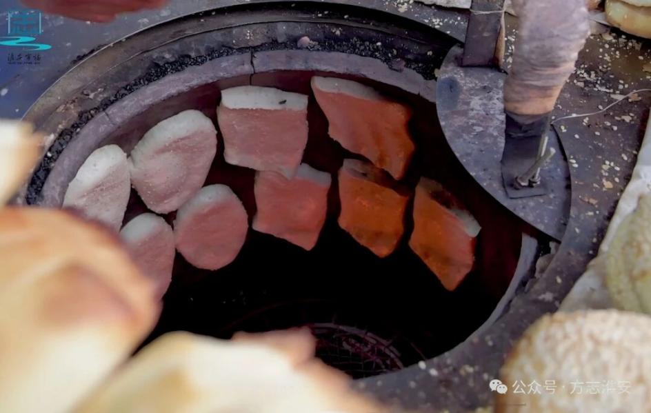 淮安的烧饼,大多是贴在烤炉内壁烘烤成的。烧饼炉子是选用一截大号铁皮桶制作,将耐火泥做好的炉膛安装在铁皮桶里,燃着的煤炭映照着炉膛。做烧饼的师傅将发酵好的面团切下一块,用手掌来回按压、拉扯,使其厚度、大小适中,再用刀子划成一块块长方形饼坯,然后在上面刷上糖浆、粘上芝麻,贴入炉膛内壁烘烤,七八分钟后取出表面焦黄酥脆、饼瓤松软柔绵,吃着满嘴生香。