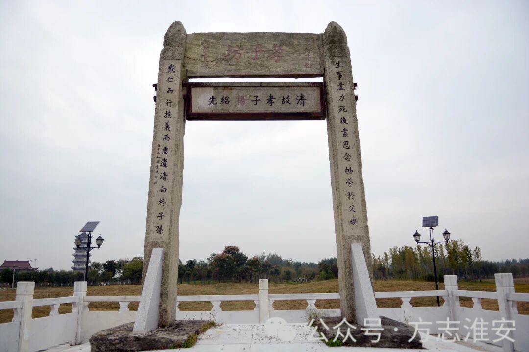 现在,黄海已距云梯关村60公里外了。宋元时,这里就是黄河夺淮的入海口。宋元在此设海关,船出了关,南可下闽浙,北可上齐鲁。现在来到云梯关村,村前广场上有一座牌坊,那是为孝子杨绍先而立。他极尽孝道,为治母病千里乞讨拜师学成医术,途经京城揭皇榜治愈太后之疾,却拒招驸马,宁受牢狱之灾也要返乡尽孝。母墓遇黄河决口时,奋不顾身以身护墓,黄水竟绕道而去。道光五年(1825),朝廷为其建造“孝子坊”,横匾刻御书“孝子坊”及“清故孝子杨绍先”,柱联题“生事尽力死后尽思念劬劳于父母,戴仁而行抱义而处遗清白于子孙”,并有“文官下轿,武官下马”的训示。