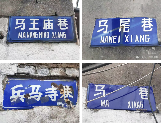 马字街巷地名有驸马巷、兵马司巷、马王庙巷、系马桩巷、马福街、马尾巷、马巷、马路街等,它们主要集中在淮安府城和河下古镇。这些街巷中,最著名的当数驸马巷。驸马巷因明代的驸马黄琛在此建有驸马府而得名。1898年3月5日,一代伟人、全党楷模周恩来诞育于此,更是让驸马巷享誉世界。兵马司巷因明朝负责地面治安捕盗的兵马司设于此而得名。马王庙巷因巷中建有马王庙而得名。河下的马巷因设有买卖马匹的市场而得名,马子巷则是马桶生产销售一条街。淮安府城的夹城中有马路街,其前身即古代正儿八经的“马路”,后来形成“马路街”,马路的尽头称之为“马路头”。