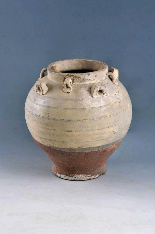 2003年冬,当地村民在甘罗城遗址鱼塘清淤时,出土了一件南北朝时期的八系白釉陶罐,通体完整,高28厘米,腹径26.6厘米,腹部刻有四层莲花瓣纹,富有浓厚的佛教色彩(图2)。就在本年3月,甘罗城遗址被市政府公布为第二批市级文物保护单位。