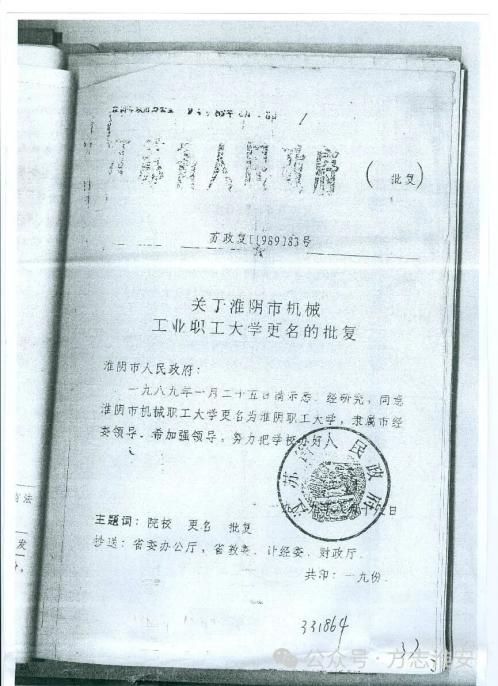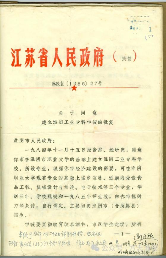 1985年,江苏省人民政府发文同意建立淮阴工业专科学校