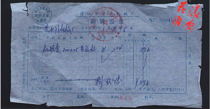 1971年清江手工机械厂出具的发票。那时淮阴的电话号码只有3位数